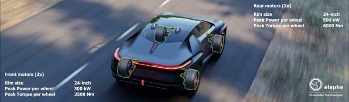Il sistema Elaphe Quad-Motor In-Wheel di Quintessenza triplica la potenza rispetto alla configurazione originale a tre motori. I motori Sonic 1, con un diametro di 21 pollici, si adattano a cerchi da 24 pollici.