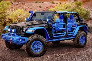 Jeep Wrangler 4xe Blueprint è una vetrina di oltre trentacinque accessori Mopar e JPP in colore blu. Jeep Wrangler 4xe Rubicon Sunchaser è pensata per escursioni prolungate con dotazioni specifiche per il campeggio.
